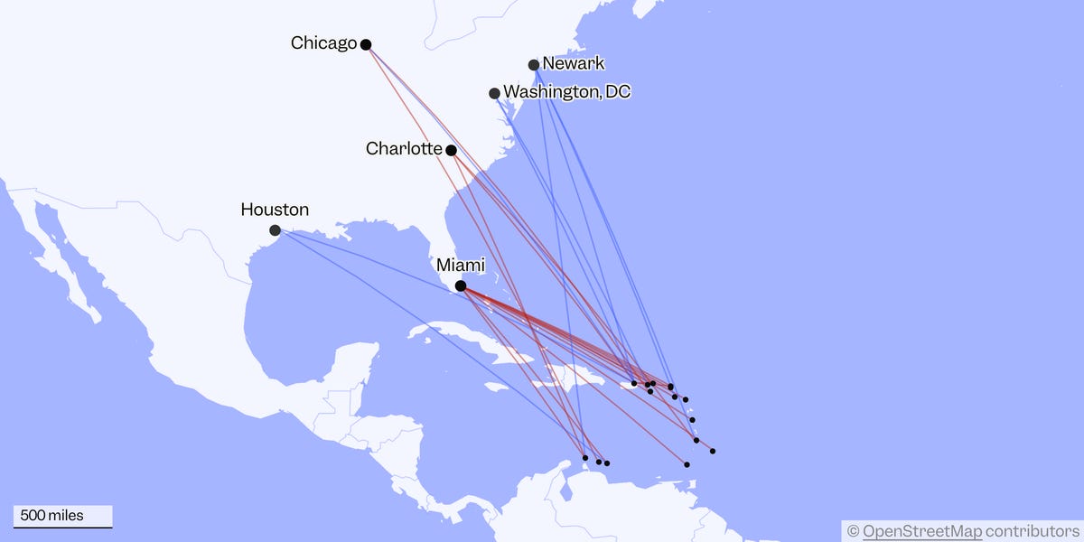 كما شهدت جزر فيرجن الأمريكية إلغاء أكثر من 140 رحلة، بينما تم إلغاء 91 رحلة في أروبا، التي تبعد حوالي 32 كيلومترًا فقط عن الساحل الفنزويلي. وقد أظهرت بيانات FlightAware حجم الاضطرابات، مع تفاوت في عدد الرحلات الملغاة من مطار إلى آخر في جميع أنحاء المنطقة.