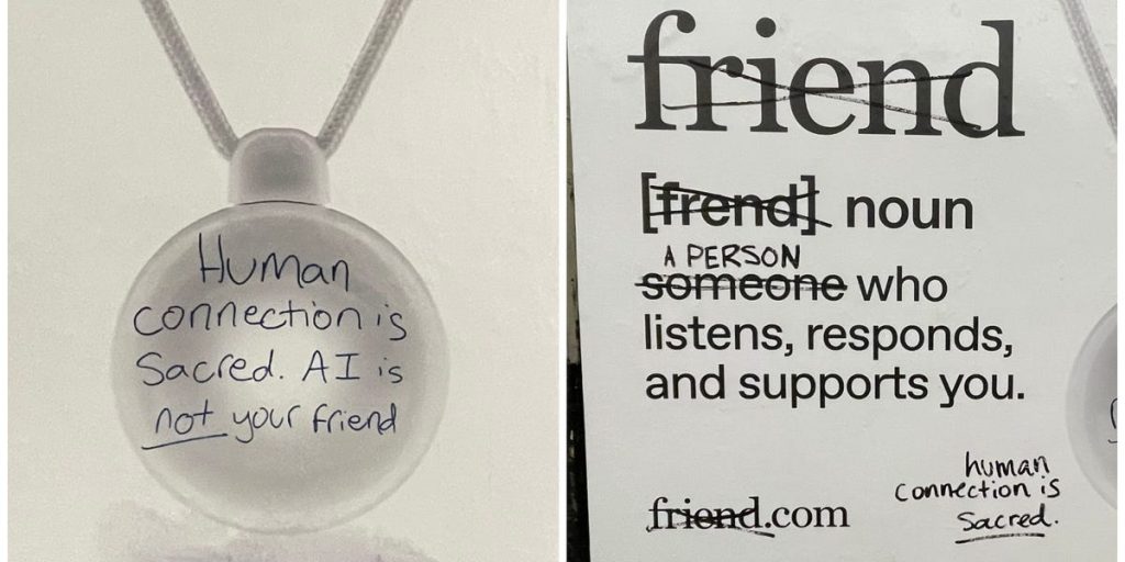 سكان نيويورك المتشككين في الذكاء الاصطناعى تشوه على الفور العديد من تلك الإعلانات مع الكتابة على الجدران المضادة للاي. تضمنت إعلانات الأصدقاء المشوهة التي تم تصويرها من قبل Business Insider عبارات مثل “Human Connection Is Sacred” و “AI ليست صديقك” ، “لن يهتم الذكاء الاصطناعي إذا كنت تعيش أو ماتت” و “أداة المراقبة”.