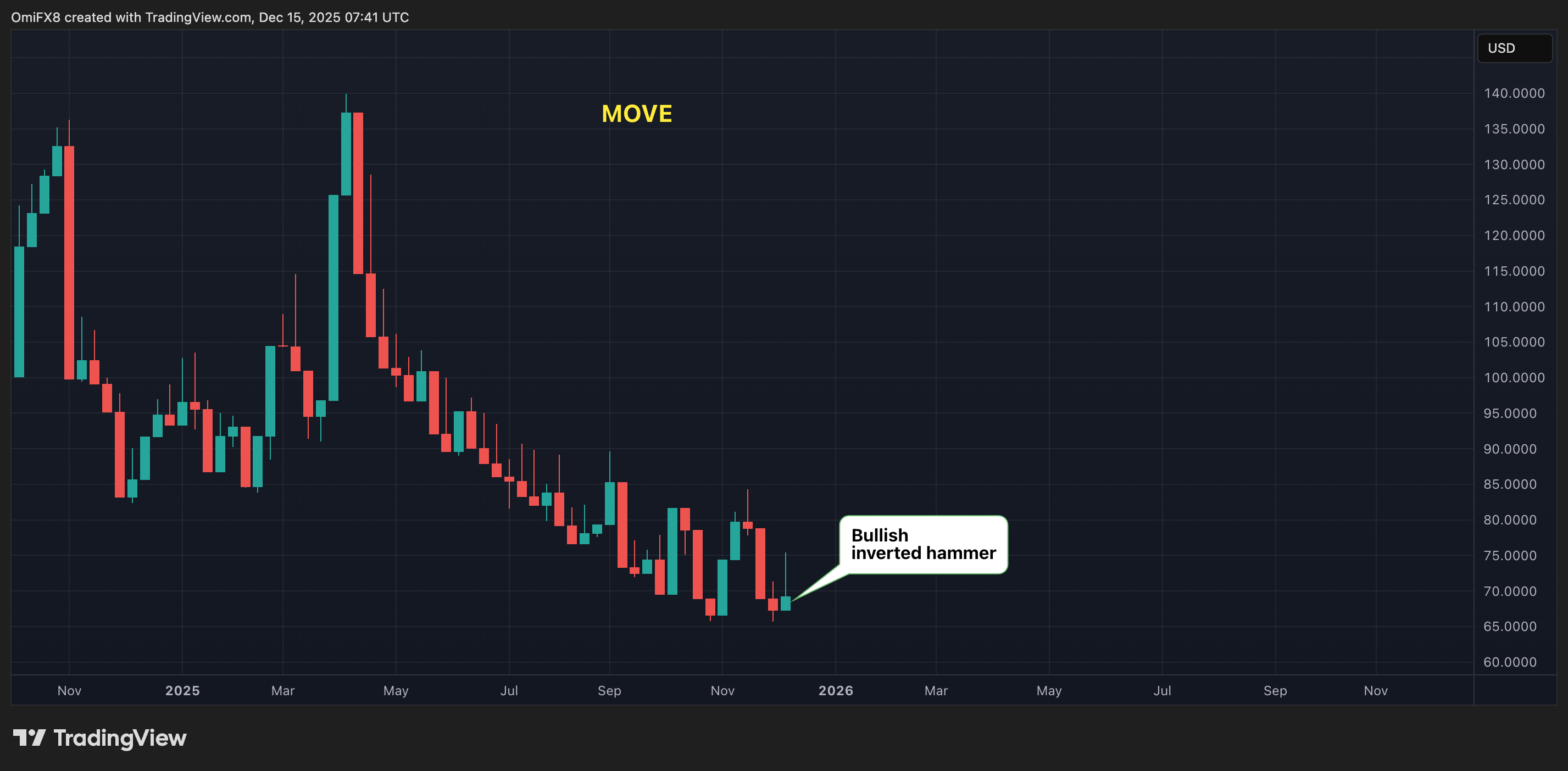 الرسم البياني الأسبوعي لمؤشر MOVE بتنسيق الشموع. (TradingView)