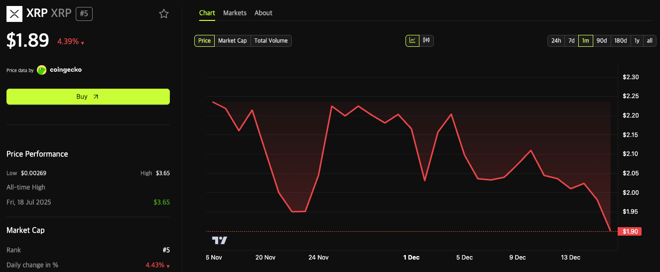 على الرغم من التدفقات القوية لصناديق الاستثمار المتداولة الفورية، إلا أن أداء سعر XRP ظل باهتًا. انخفض سعر الرمز المميز بنحو 15٪ خلال الشهر الماضي وكان يتم تداوله عند 1.89 دولارًا وقت الصحافة. قد يكون هذا التباين مرتبطًا بآليات أسواق صناديق الاستثمار المتداولة.