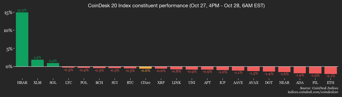 - يبرز رمز واحد: هبار0.2055 دولار. وقد قفز هذا بنسبة 17٪ خلال الـ 24 ساعة الماضية بعد الإعلان عن إدراج صندوق HBAR ETF التابع لشركة Canary Capital في بورصة NYSE Arca عندما تفتح الأسواق يوم الثلاثاء.