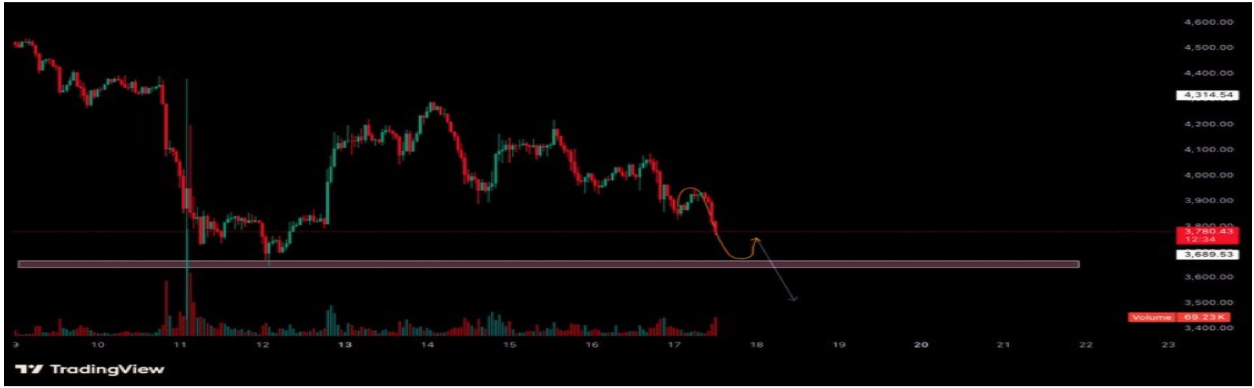 محللون آخرون مثل مارزيل فعلوا ذلك ردد مخاوف مماثلة، تشير إلى أن إيثريوم تقترب الآن من “منطقة الانهيار”. ومع ذلك، فقد سلط الضوء أيضًا على النطاق الذي يتراوح بين 3690 دولارًا و3750 دولارًا كمنطقة طلب محتملة على المدى القصير حيث يمكن للمشترين التدخل مرة أخرى وتحفيز الخطوة التالية للأعلى.