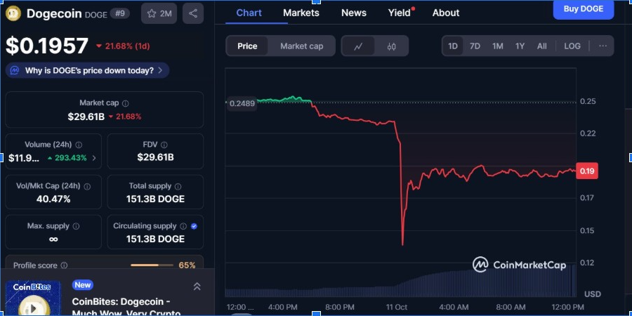 عانت دوجكوين (DOGE) من أكبر الانخفاضات بين أفضل ١٠ أصول، حيث انخفضت بأكثر من ٢١٪ ليتم تداولها بالقرب من ٠,١٩٥ دولار. جاء هذا الانخفاض بعد استقرار قصير الأمد حول 0.25 دولار، مما أدى إلى عمليات تصفية واسعة النطاق وشلالات وقف الخسارة. انخفضت القيمة السوقية إلى 29.55 مليار دولار مع اندفاع المتداولين للخروج من مراكزهم.